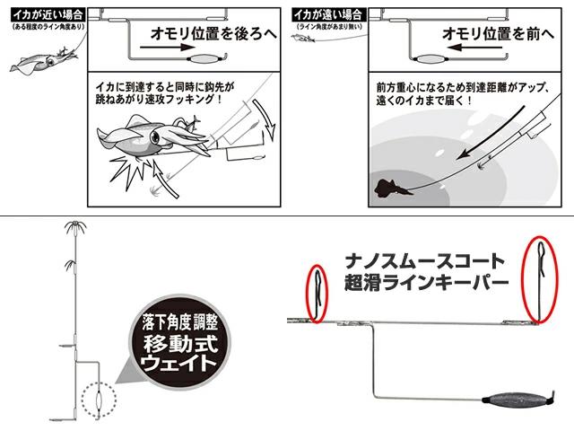オフセットされたオモリは重心を低くし滑走時のブレを防止。「ナノスムースコート」のラインキーパーと相まって滑らかに素早くヤエンが到達します。移動式オモリは軸上で位置調整ができ、イカとの距離・糸の角度により最適に調整できます。