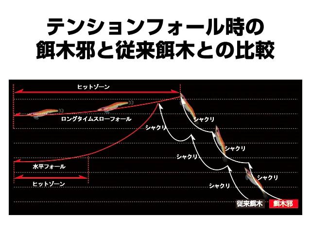 ボディー、ウェイト、フックなど全てのパーツのバランスによりエギのローリングを抑え、フリーフォールでは素早く着底し、ラインテンションをかけた状態ではイカが最も抱き易いとされる水平姿勢で、より長い時間スローにフォール(ロングタイムスローフォール)するようにセッティング。エギの動(ダートアクション)と静(フォール)とのメリハリをはっきりつけることに成功しました。