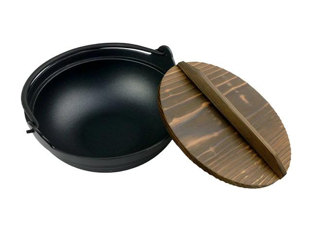 日本昔話に出てくるような木蓋付きで情緒のある昔ながらのお鍋です。フッ素加工済みでお手入れかんたん。アルミ製で熱伝導がいいので簡単に調理が楽しめます。アウトドアや普段使いにもオススメです。カセットコンロやミニコンロでアルコールバーナー、固形燃料などの熱源が最適です。囲炉裏や焚き火などで吊るしても楽しめます。料理の幅が広がり、調理が楽しくなるお鍋です。