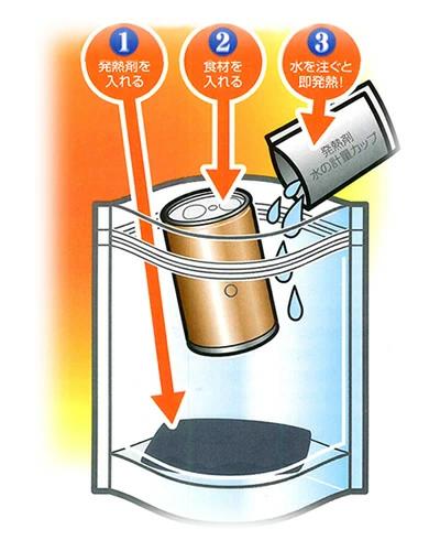 加熱袋に発熱剤と温めたい食材を入れ、あとは水を入れるだけですぐ発熱。約100℃ まで上昇し、発熱は15~20分間持続します。
