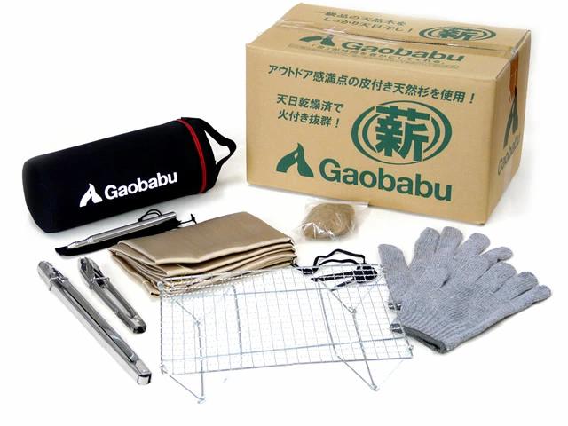 ■セット内容:Gaobabuコンパクトメッシュ焚き火台(火吹き棒付き)、Gaobabu杉薪(約5kg)、焚き火シート(耐熱グラスファイバー78cm×57cm)、スタンドロースター(焼き網)、軍手、火バサミ、マグネシウム火打石、麻綿、肉挟みミニトング