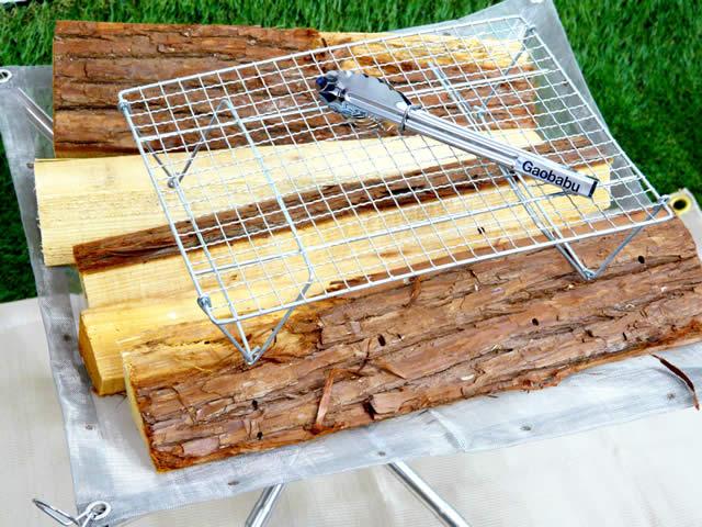 セットの杉薪(5kg)は天日乾燥済みで火付き抜群!アウトドア感満点の皮付き国産天然杉です。また、芝生などの地面を焦がす可能性がある場所でも焚き火シートがあるので安心です。火の粉や飛び火保護シートとしても利用可能です。薪の上にセットできるスタンドロースター(焼き網)や肉挟みミニトングも付属していますので、フライパンでの調理やBBQも楽しめます。