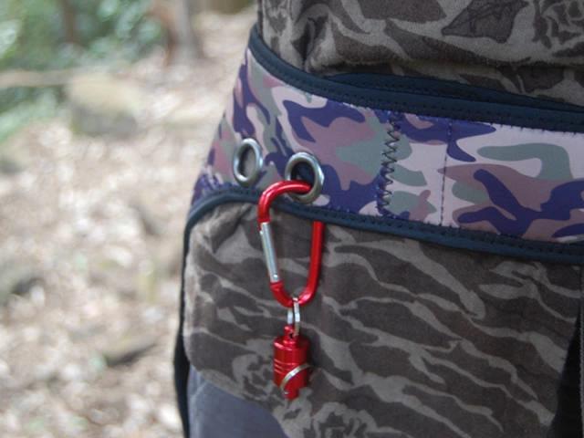 腰のあたりにハトメ穴が 4 個空いているのでそこにカラビナやペットボトルホルダー、タオルなどをぶら下げておくことも出来ます。