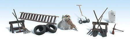 ハシゴ、スコップ、つるはし、鋤、熊手、ゴミを漁るアライグマ、ゴミ箱、芝刈機、古タイヤなどガレージや物置を埋める小物類です。