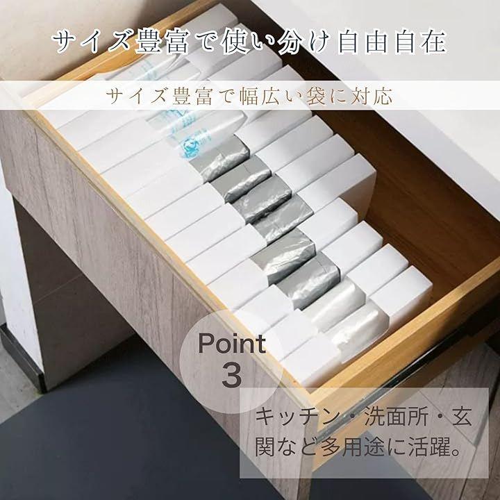 「すっきり整理で取り出しやすい収納」スリムな組み立て式デザインが引き出し内に収まり、かさばりがちなビニール袋を整頓。
