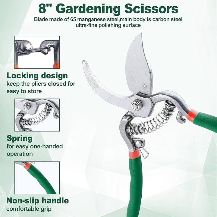 「園芸ハサミ 」「仕様」材質: 本体:炭素鋼、刃:65マンガン鋼、表面:ポリッシュ仕上げ、軽くて持ちやすいハンドル、「サイズ」:製品の全長は213mm/8.39インチ、ハンドルの閉じた幅は55.1mm/2.17インチ、ハンドルの長さは97.8mm/3.85インチです「注意」1.お子様の手の届かないところに保管してください。