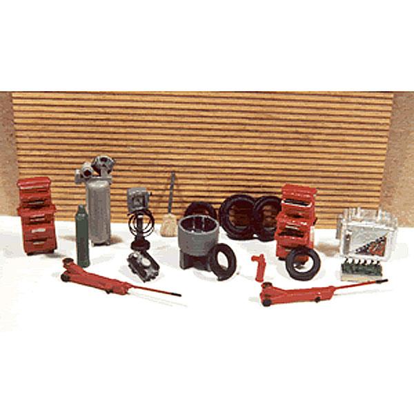 ガソリンスタンドを惹きたてる小物セットです。内容:ツールチェスト(工具箱)、フロアジャッキ、縦型コンプレッサー、ガスボンベ、バーナー、タイヤタブ、空気メーター、エンジン、ほうき、タイヤ、クーラーボックス、ボトルケース、材質:金属