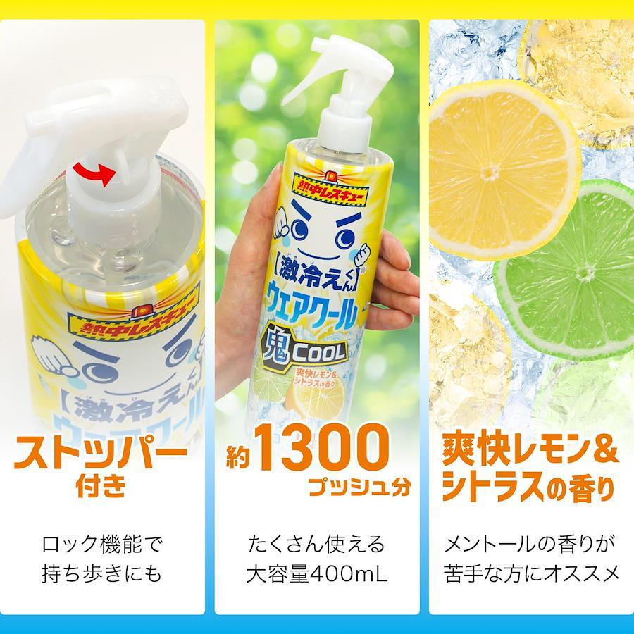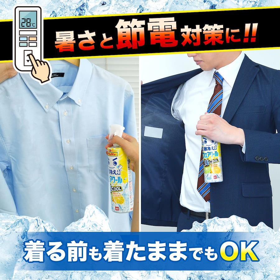 ●衣類や布類にスプレーするだけで、ひんやりした気持ち良さが続きます。※(冷感持続成分配合)●爽快レモン&シトラスの香り。※ひんやり感の感じ方には、個人差があります。 外気温や使用環境により、ひんやり感の感じ方は異なります。 暑い屋内外でシュっとスプレーするだけ!使ってすぐシャキーン!とCOOL体感。爽快レモン&シトラスの香り。