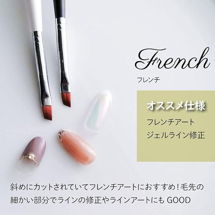 定番のオーバルブラシオススメ仕様 ベースジェル、カラージェル、トップコート 2.French フレンチ斜めにカットされていてフレンチアートにおすすめ。毛先の細かい部分でラインの修正やラインアートにも〇オススメ仕様 フレンチアート、ジェルライン修正
