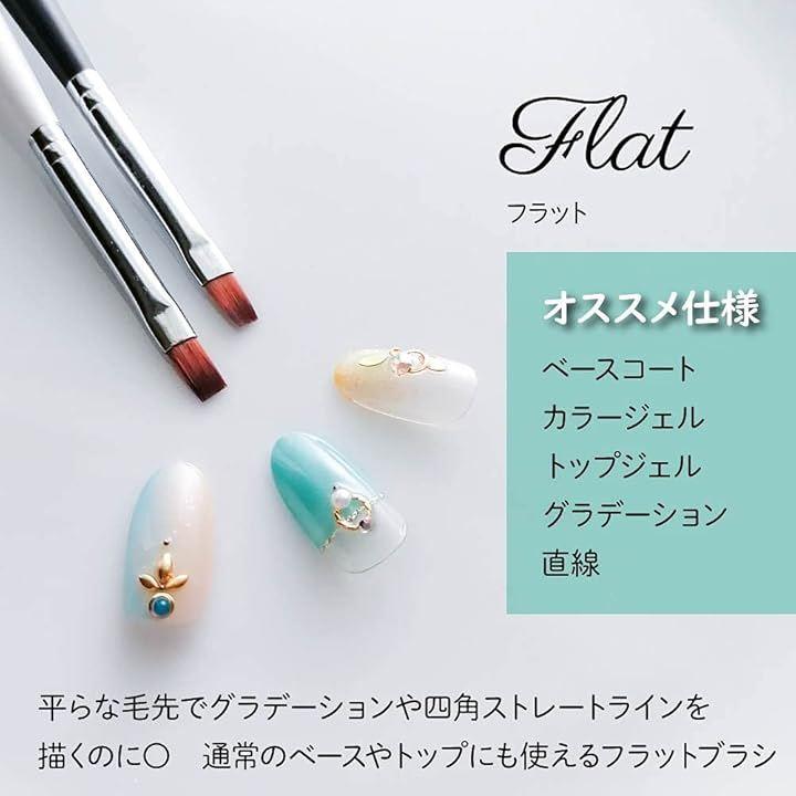 3.Flat フラット平らな毛先でグラデーションや四角ストレートラインを描くのに〇通常のベースやトップにも使えるフラットブラシオススメ仕様 ベースコート、カラージェル、トップジェル、グラデーション、直線 4.Art 8mm アート8mmアートに必須のアートライナーブラシ。これ1本で様々なアートが 楽しめる。