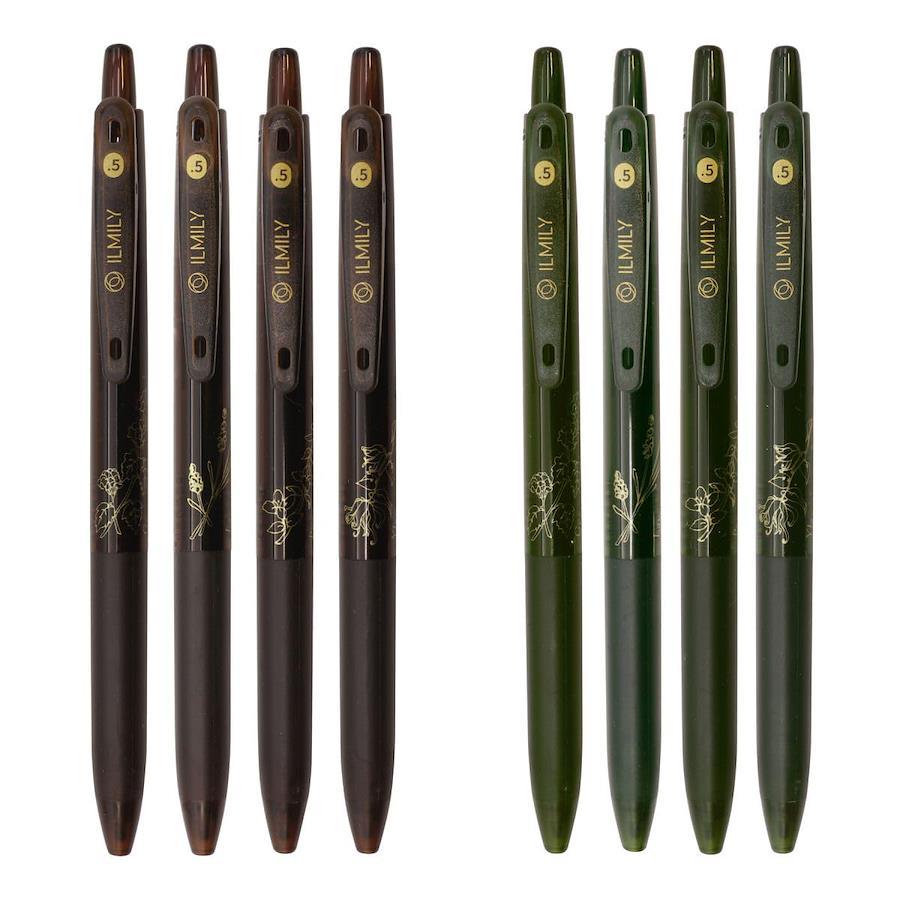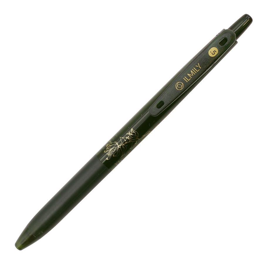 天然精油を配合した新開発のインキで、筆跡からほのかにハーブの香りがするゲルインキボールペンです。アロマオイルの中でも人気の高いイランイランの香りです。。軸はアロマオイルに用いられる濃色の遮光瓶をイメージしたグリーンのクリアボディ。そこに香りのモチーフとなったハーブのイラストをゴールドの線画でデザインしています。。インク色:黒。。サイズ:縦=143mm 横=10mm 厚さ=15mm。商品色傾向:緑。。イラスト。表紙パターン:その他植物。