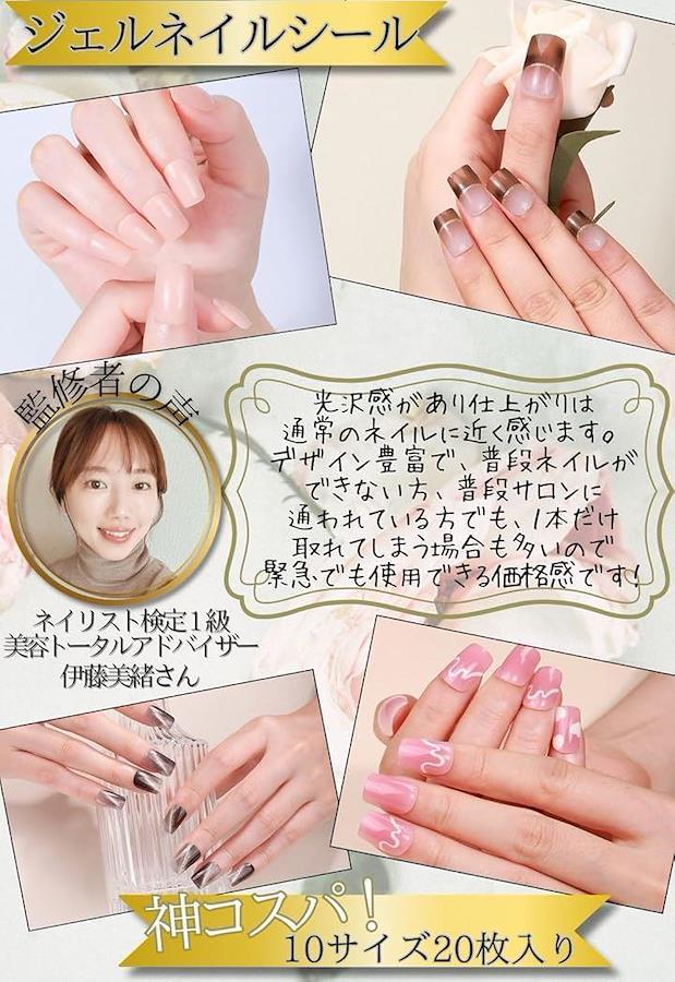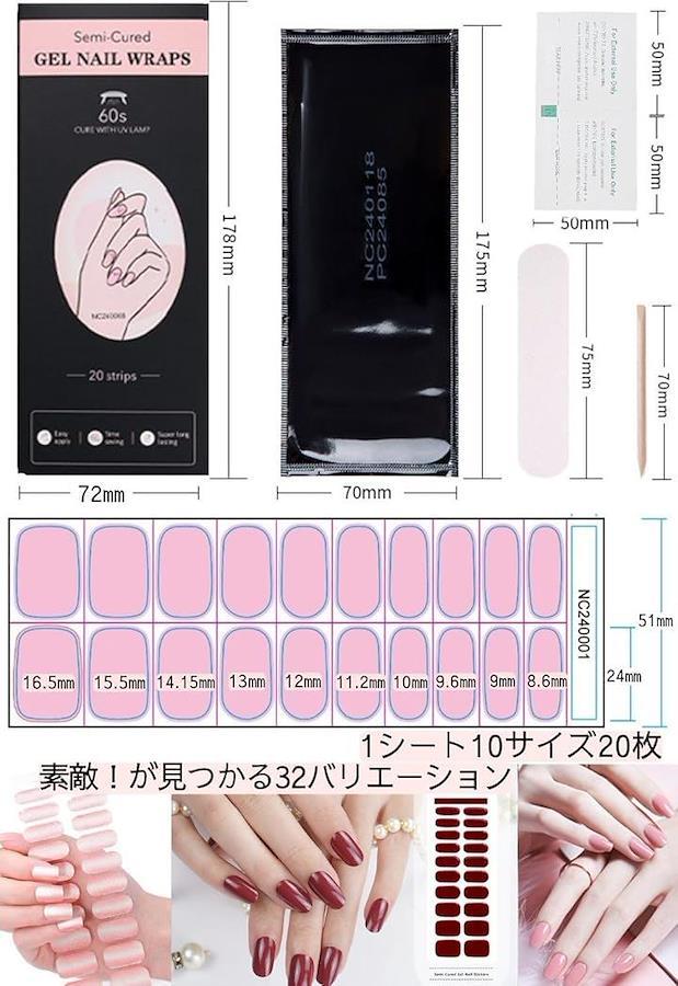 1シートに10サイズ、20枚のジェルネイルシール。 生ジェルを半硬化させたネイルシールで柔らかく伸びやすく貼りやすいです。