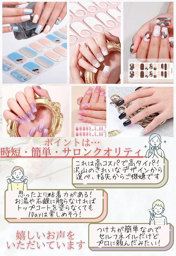 1シートのなかに爪の幅に合わせて10サイズの中から選べて20枚の高コスパ。 簡単にお湯でOFFができ、爪に優しい仕様のため、仕事や子育てなどで忙しい方にも。