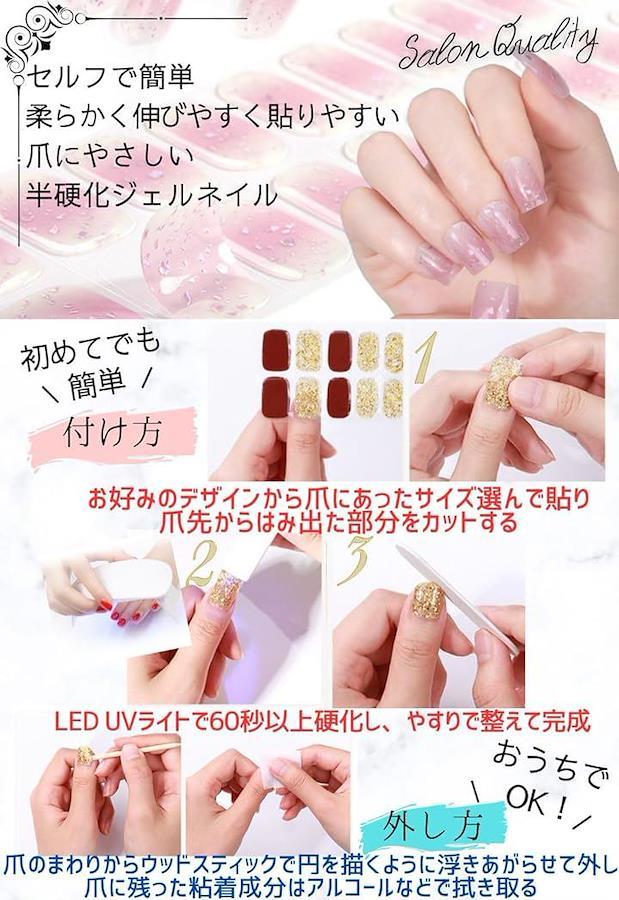 LEDライトで硬化させさらに高密着。剥がれにくくつけ方も簡単。セルフネイルなのにサロンの様な立体感&ツヤ感に仕上がり、ネイルポリッシュやジェルネイルに比べ時短でぷっくりとした美しいネイルを楽しめます。