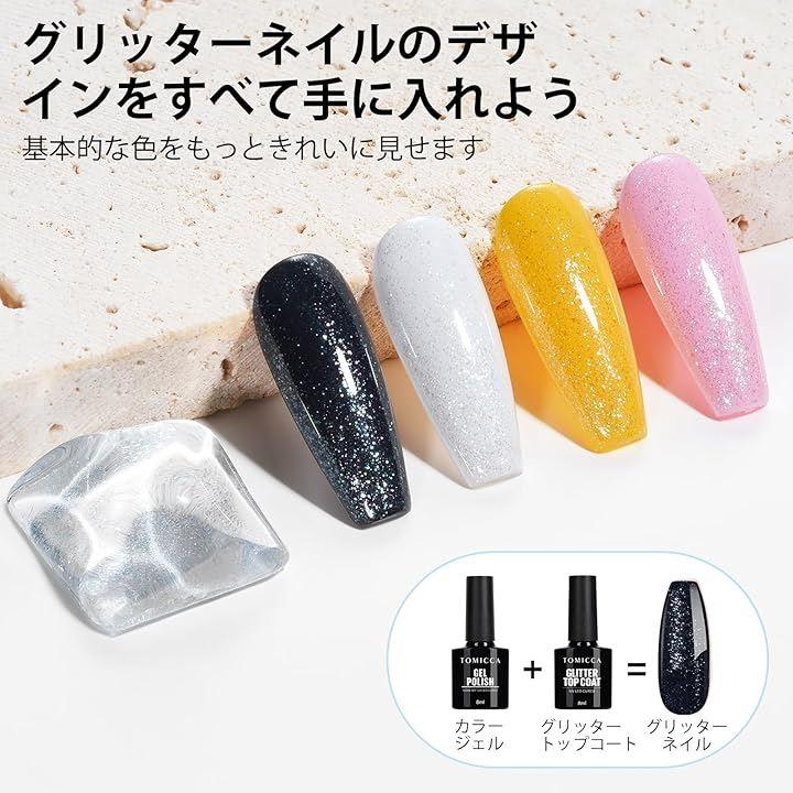 グリッター ジェル ネイル: TOMICCA は、この半透明のジェル ネイル 、キラキラ光る粒子のグリッターをたっぷり加えました。