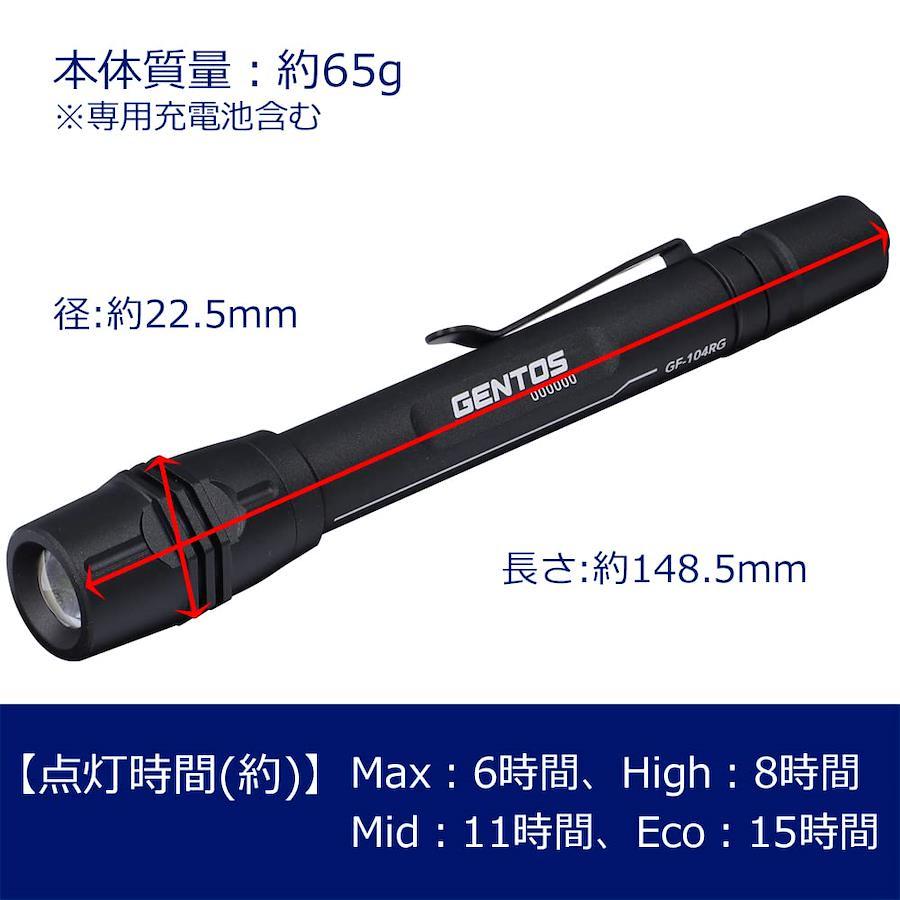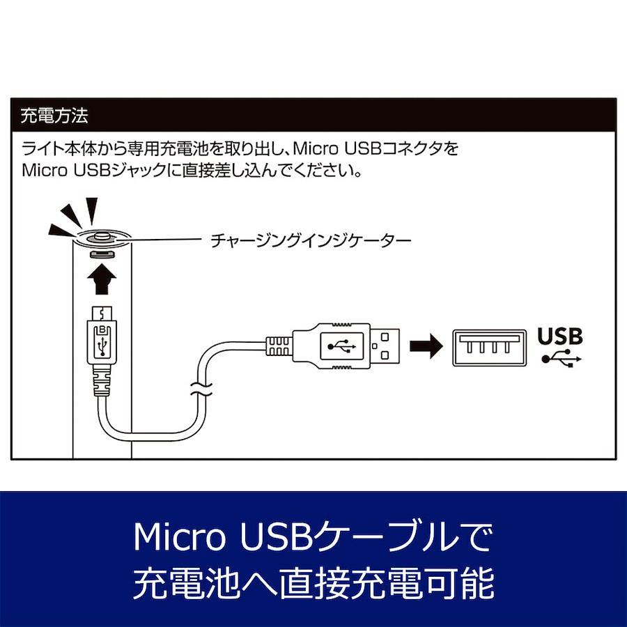 ●付属の専用充電池か別売りの電池でも使用できるハイブリッド式のLEDライトです。●充電池に直接充電が可能です。●ハイブリッド式高出力型ペンライトです。●明るさ4段階切り替えが可能です。●ヘッド部をスライドさせるとスポットビーム・ワイドビームと用途に応じて照射角度を無段階に調節できます。●夜間の作業現場に。●屋内での点検作業に。サイズ:約直径22.5×148.5mm、本体重量:約65gセット内容・付属品:本体、マイクロUSBケーブル (50cm)、ペンクリップ、専用充電池 (内蔵) GA-14明るさ:Max/130ルーメン、High/80ルーメン、Mid/40ルーメン、Eco/20ルーメン、使用電池:専用充電池または単4形アルカリ電池×2本 (別売り)実用点灯:Max/6時間、High/8時間、Mid/11時間、Eco/15時間機能:2m落下耐久、耐塵・耐水仕様 (IP66準拠)、最大照射距離:約50m