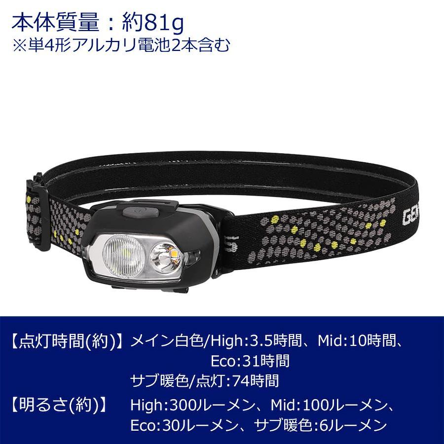 メイン3段階調光機能 + サブ暖色LED搭載耐塵・耐水・1m防水仕様 (IP66、IP67準拠) &1m落下耐久80度可動式ヘッドヘッドプッシュスイッチサイズ:約幅72.2×奥行34×高さ40.2mm、本体重量:約81g (電池含む)セット内容・付属品:本体、すべり止め付きヘッドバンド、テスト用電池 (単4形アルカリ電池×2本)明るさ:High/300ルーメン・Mid/100ルーメン・Eco/30ルーメン、サブ暖色LED/6ルーメン、使用電池:単4形アルカリ電池×2本実用点灯:High/3.5時間、Mid/10時間、Eco/31時間、サブ暖色LED/74時間機能:1m落下耐久、耐塵・耐水・1m防水仕様 (IP66・IP67準拠)、最大照射距離:約66m