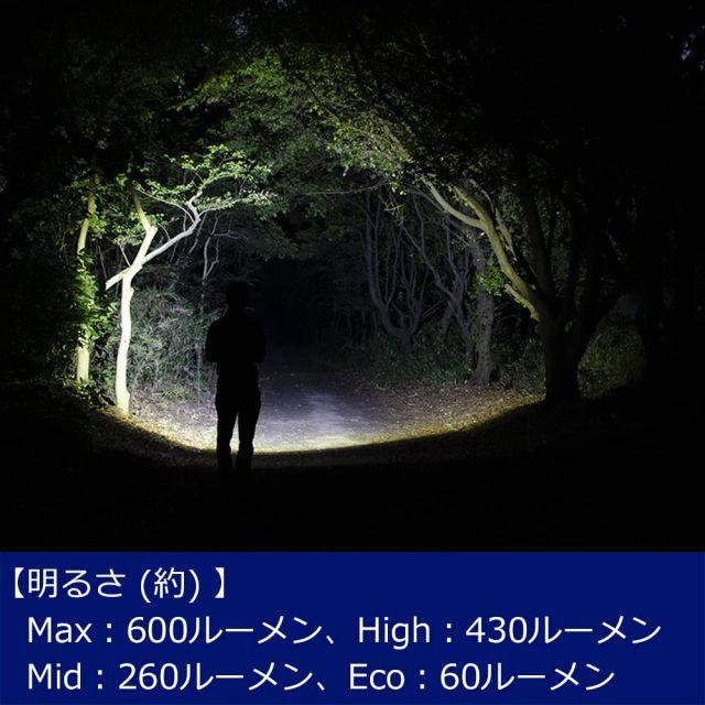 明るさ:Max/600ルーメン、High/430ルーメン、Mid/260ルーメン、Eco/60ルーメン、使用電池:専用充電池