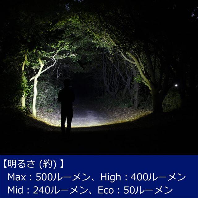 明るさ:Max/500ルーメン、High/400ルーメン、Mid/240ルーメン、Eco/50ルーメン、使用電池:専用充電池