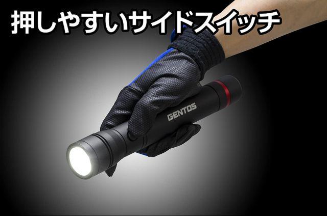 Maxモード1000ルーメンの高出力フラッシュライトスライドフォーカスシステムヘッド部分を前後させることで、片手で簡単に照射角調整をする事ができるインスタントオフスイッチ点灯後、一定時間経過後にスイッチを押すと、どのモードからでも一回の操作で消灯できるMaxモード1000ルーメンの高出力を含む4段階の調光機能耐塵・耐水仕様(IP66準拠)&2m落下耐久サイドスイッチ