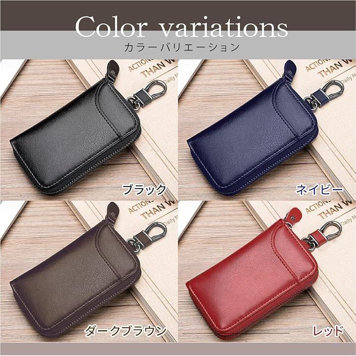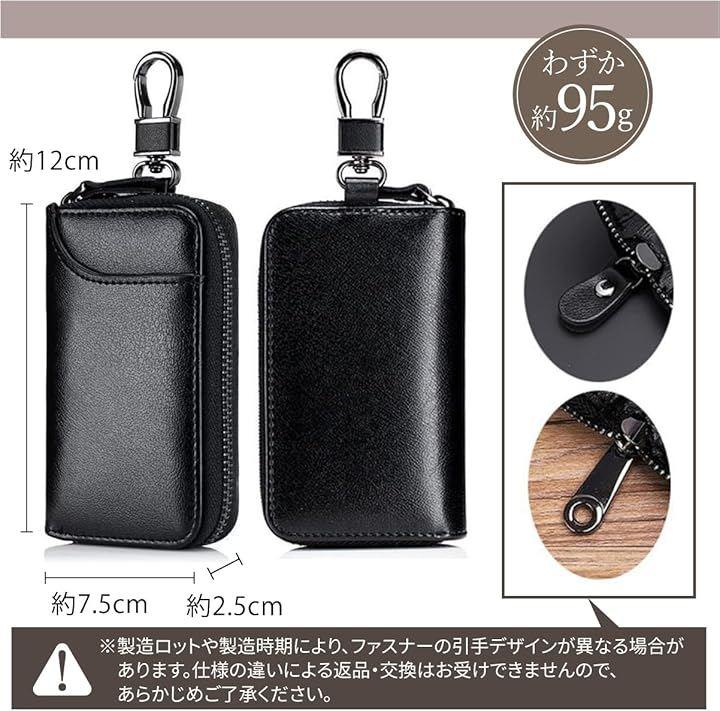 「仕様」 *6連キーフック/チェーン付リングx1/取り外し可能ボタンリングx1/カードスロットx3 *カラーバリエーション:ブラック(黒色)/ネイビー(藍色)/ダークブラウン(こげ茶色)/レッド(赤色) *サイズ:12x7.5x2.5cm *重さ:95g *素材:(表)本革/(裏)PU合成皮革/合金 *中国製