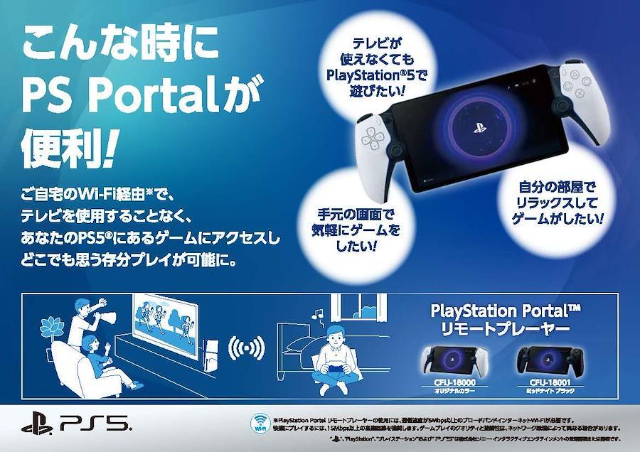 PlayStation 5のゲームをあなたの手のなかで。 PlayStation Portal リモートプレーヤーは、PS5 のゲーム体験を手元で実現するリモートプレイ専用のデバイスです。 アダプティブトリガーやハプティックフィードバックなどのDualSense ワイヤレスコントローラーの主要な機能を備え、8インチ・解像度1080p・60fpsでの描画に対応した液晶ディスプレイは、世界中のゲームクリエイターが生み出す素晴らしいゲームの数々を美麗なグラフィックでお楽しみいただけます。 PlayStation PortalがPS5 本体にWi-Fi経由で接続することで、PS5 からゲームプレイをそのまま引き継いでPlayStation Portalでお楽しみいただけます。 ※PlayStation Portal リモートプレーヤーでゲームをプレイするためにはPS5本体と、Wi-Fi接続で最低5Mbps のブロードバンドインターネット接続環境が必要です。よりよいプレイ体験のためには15Mbps 以上の高速な接続環境を推奨します。 ※ハプティックフィードバックとアダプティブトリガーは、対応しているゲームにおいてのみ使用できます。 ※ VRヘッドセット(PlayStation VRもしくはPS VR2)を必要とするゲーム、および追加の周辺機器(ワイヤレスコントローラー(DUALSHOCK 4)、DualSense ワイヤレスコントローラー、 DualSense Edge ワイヤレスコントローラーを除く)を必要とするゲームは対応しておりません。また、PlayStation PlusプレミアムのサービスであるPS5本体でのクラウドストリーミング機能が必要なゲームは対応しておりません。