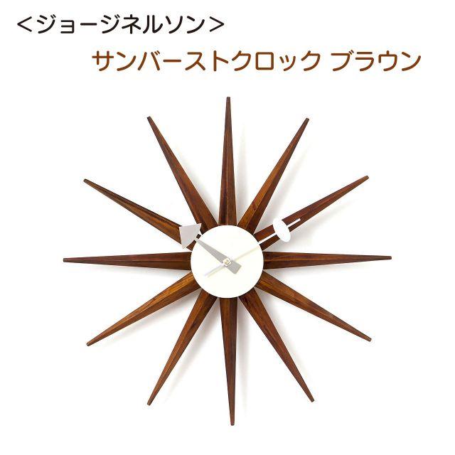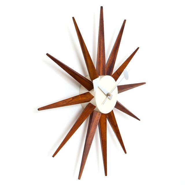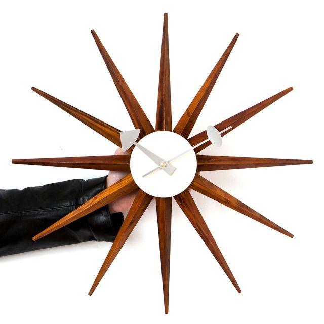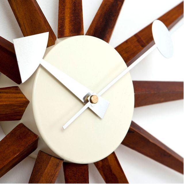 サンバーストクロックは1957年にジョージ・ネルソン(GeorgeNelson)によって製作されました。太陽が光輝くような様をモチーフにしたような、遊び心あふれるデザインとなっております。突き出すような光の線は、見るものを楽しくさせてくれます。また照明によって出来る影が、白い壁に投影されるとインテリアのポイントとなります。ネルソンクロックとも呼ばれる一連のシリーズは、その特徴的な形態からデザインの古典的なアイコンともなっています。時計としての機能だけではなく、見て楽しいインテリアのアクセントとしても非常に人気があります。ミッドセンチュリーを彷彿とさせるアメリカンテイストのお部屋にはもちろん、モダンなテイストのインテリアにもどんなスタイルにもマッチします。
