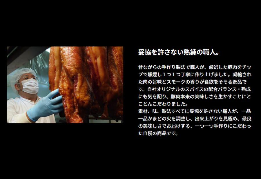 厳選した北海道産豚肉を使用し、直火式炭火燻煙製法で旨みと香りを最大限に引き出しました。