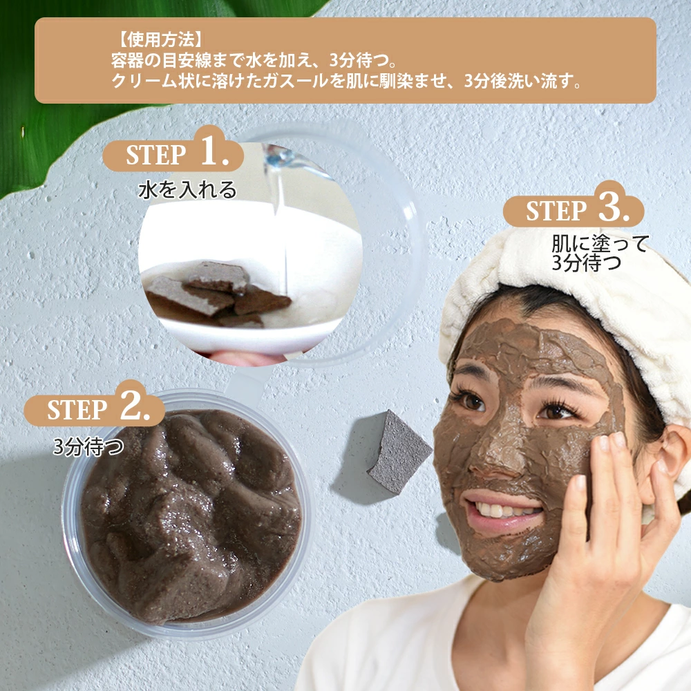 【使用方法】容器の目安線まで水を加え、3分待つ。クリーム状に溶けたガスールを肌に馴染ませ、3分後洗い流す。