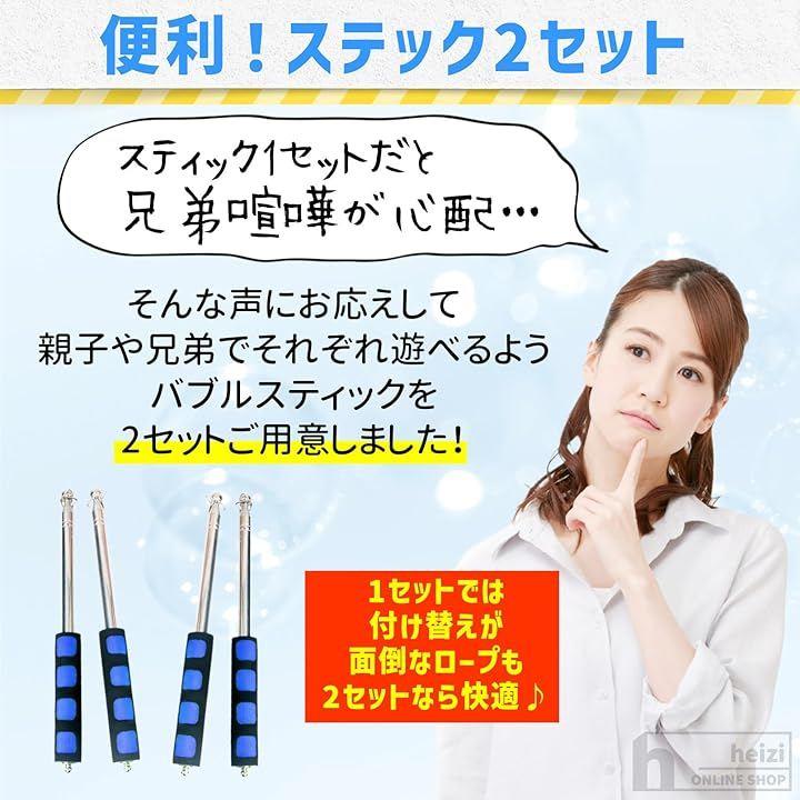 「便利。ステック2セット」スティック1セットだと兄弟喧嘩が心配?そんな声にお応えして、親子や兄弟でそれぞれ遊べるよう、バブルスティック2セットご用意しました。1セットでは付け替えが面倒なロープも2セットなら快適。