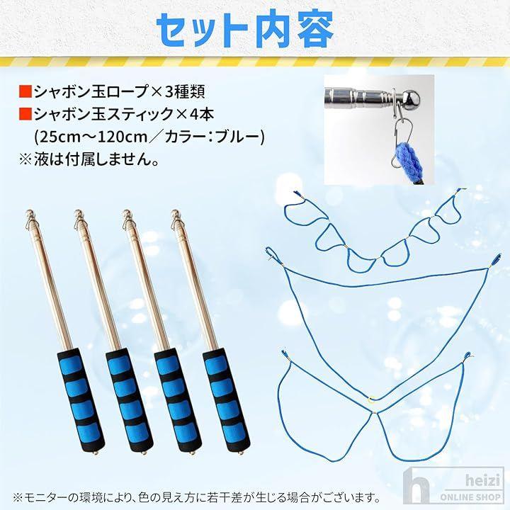 「セット内容」シャボン玉ロープx3種類・シャボン玉スティックx4本(サイズ:25cm~120cm カラー:ブルー) *液は付属しません。