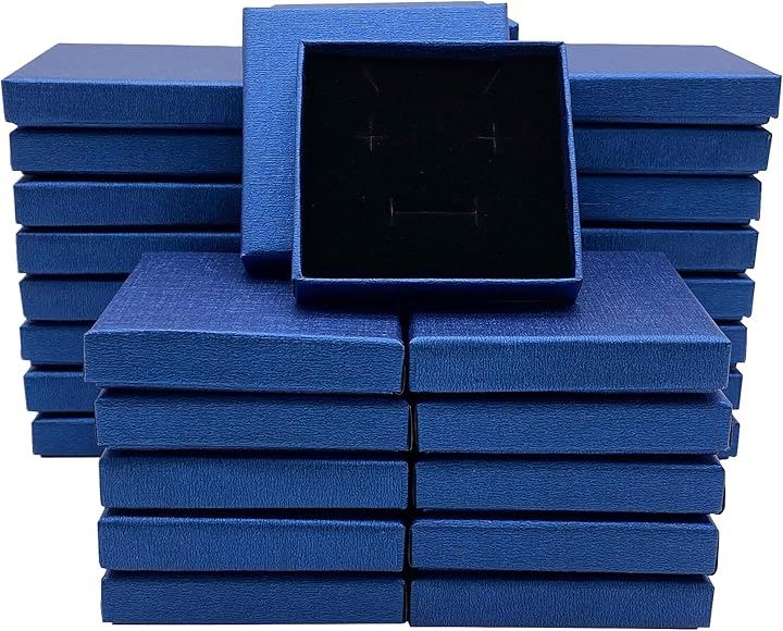 「商品内容」ギフトボックス 薄型タイプ:36個セット カラー:ブルー サイズ:8x8cm(正方形) 厚み:1.5cm 素材:クラフト紙 備考:黒スポンジ付き(ジュエリー用の切り込み有)