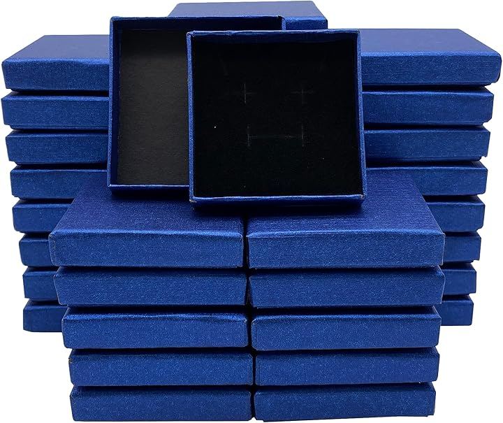「商品内容」ギフトボックス 薄型タイプ:36個セット カラー:ブルー サイズ:7x7cm(正方形) 厚み:1.5cm 素材:クラフト紙 備考:黒スポンジ付き(ジュエリー用の切り込み有)