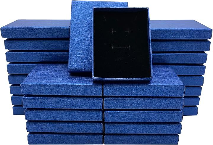 「商品内容」ギフトボックス 薄型タイプ:36個セット カラー:ブルー サイズ:7x9cm(長方形) 厚み:1.5cm 素材:クラフト紙 備考:黒スポンジ付き(ジュエリー用の切り込み有) *工場生産時期により若干、箱の形状が異なる場合がございます。