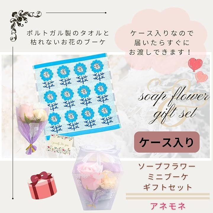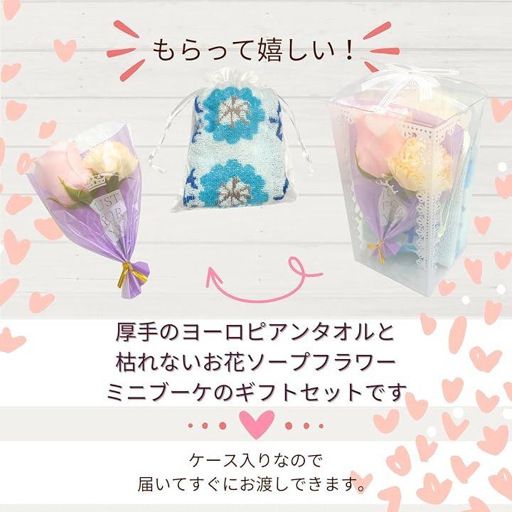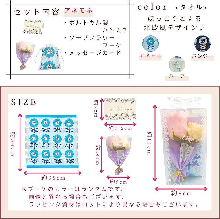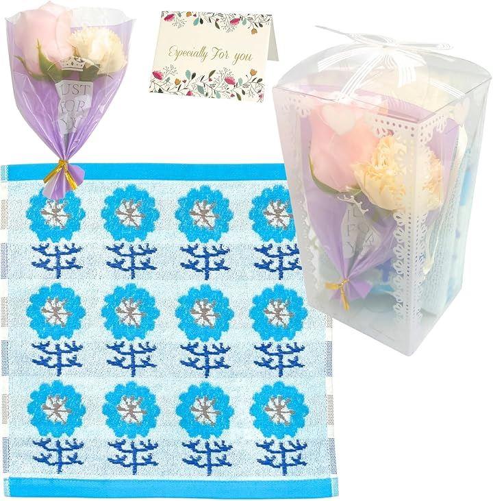 「商品仕様」タオルサイズ:約34x35cm,素材:綿100%,カードサイズ:約7x9.5cm,ギフトBOXサイズ:約15x8x8cm,畳んだタオルのサイズ:約12.4x7.5x4.5cm,ソープフラワーブーケ:約14x9cm *ブーケの花やカラーはランダムです。