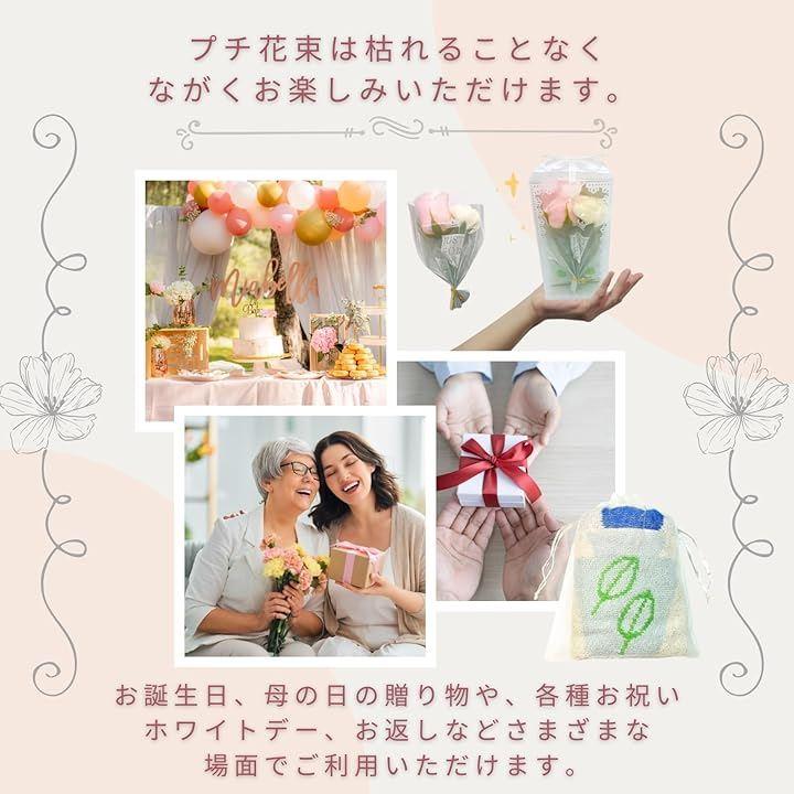 プチ花束は枯れることなく、ながくお楽しみいただけますので お誕生日、母の日の贈り物や、各種お祝いやホワイトデー、お返しなどさまざまな場面でご利用いただけます。
