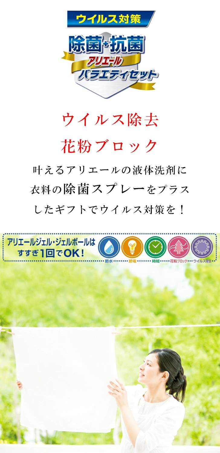ウイルス除去、花粉ブロックを叶えるアリエールの液体洗剤に衣料の除菌スプレーをプラスしたギフトでウイルス対策を!