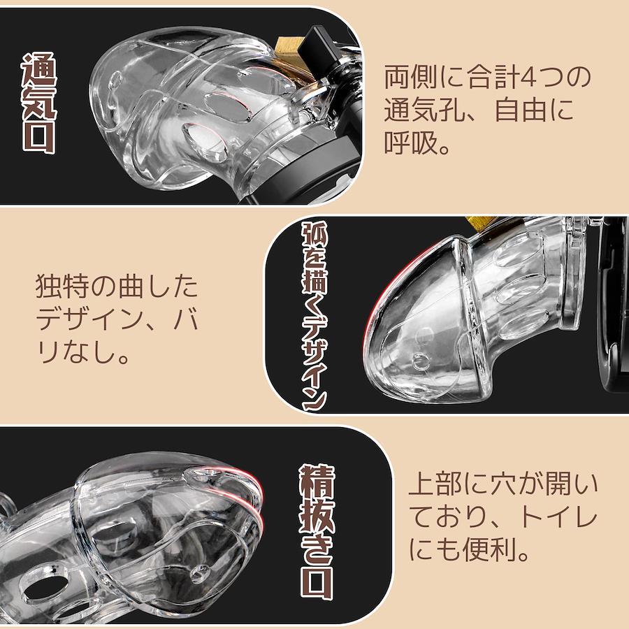 【商品仕様】:この貞操具は6種類のサイズ調整が可能で、指輪の内径サイズは5.8 cm、5.4 cm、5 cm、4.8 cm、4.4 cm、4 cmで、自分の都合に合わせて適切なサイズを選ぶことができ、初心者~上級者の使用に適している。 ?【多数の通気用孔】:清潔と汗防止のため、貞操ロックには多数の通気孔を設置しています。大きい孔は排尿用です。 ?【sm拘束感up~】:この貞操具には鍵と鍵がついており、パートナーの欲望をロックすることができます。smプレイヤーには必携のアイテムで、普通の生活に飽きて新感覚を求めるカップルや夫婦にも最適です。 ?【優れた材質】:ポリカーボネイト素材で作られ、無毒、無味、軽くて、移働にも負担がありません。 ?【秘密梱包】:お客様のプライバシーをお守りするために、商品は外から見えないよう、厳重に梱包してお届けいたします。ご安心ください。
