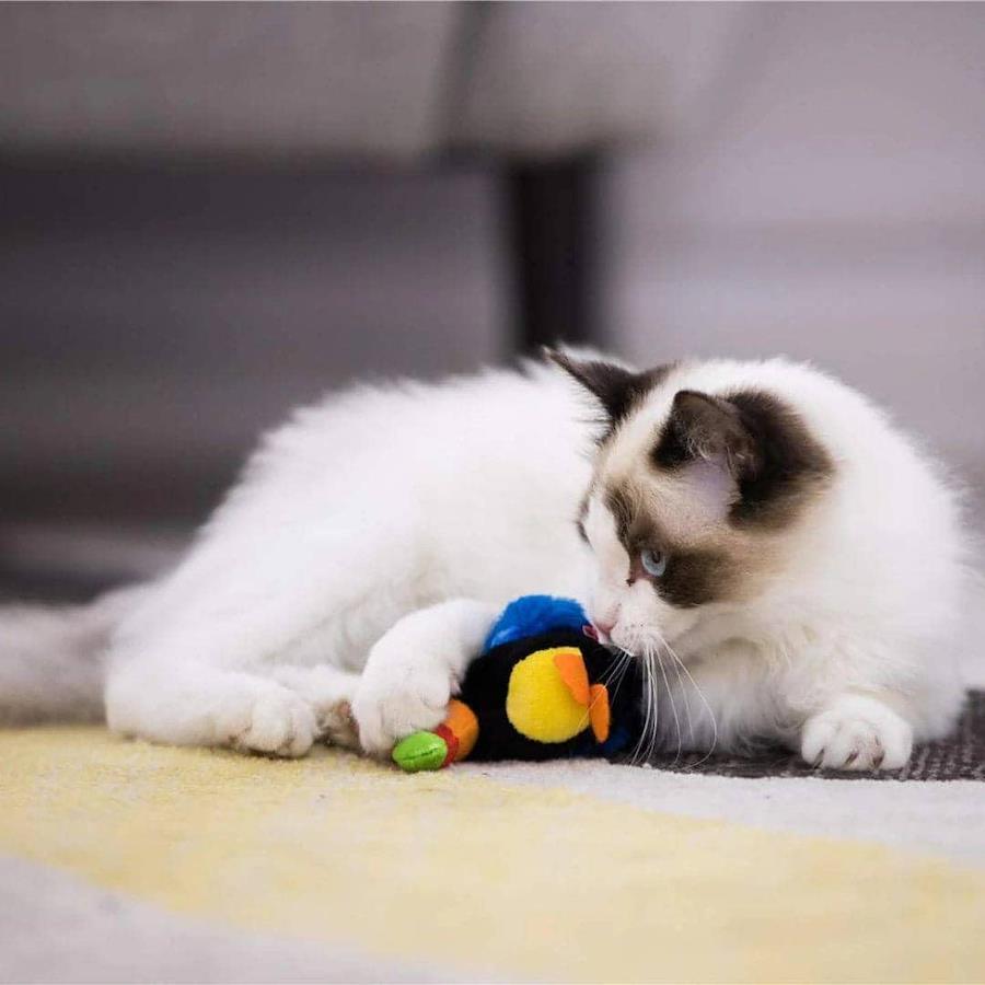 ●ユニークな表情の動物に少し触れるだけでリアルな鳴き声を奏でるサウンドチップ入りのキャットトーイ。