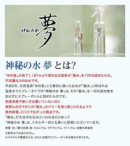 天然温泉、ゆの里の地下1,187mに湧く温泉水「銀水」をそのままスプレーボトルに詰めたものです。豊富なミネラルが絶妙なバランスで溶け込んでいます。界面活性力・酵素活性力が高く、分子がとても細かいので、シュッとスプレーしたところに素早く馴染んで浸透してくれます。【重要】メーカーによる商品リニューアルに伴いパッケージ(内容量も含む)変更が行われた場合、新パッケージでお届け致します事ご了承願います。
