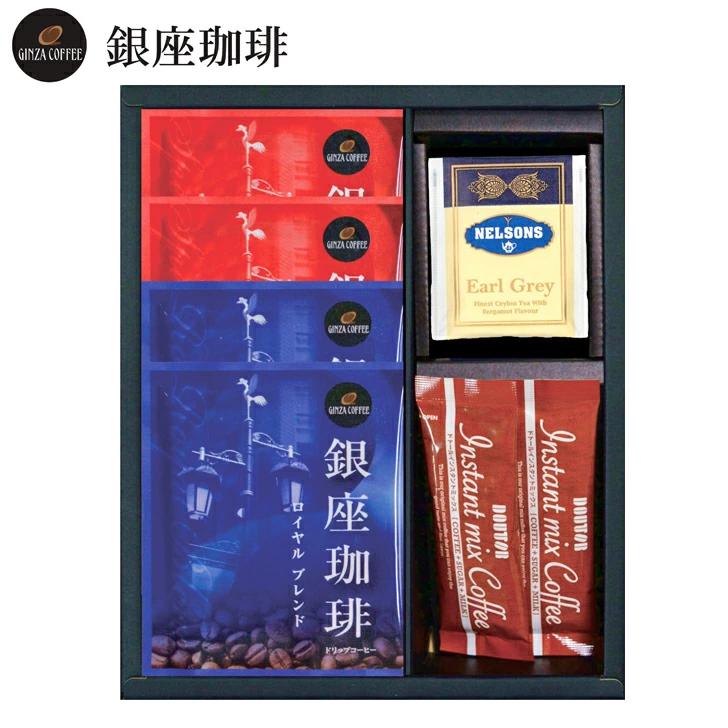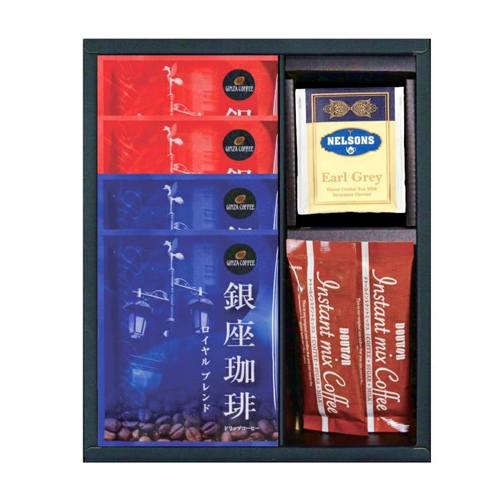 銀座珈琲ロイヤルブレンド、銀座珈琲スペシャルブレンド各7g、ドトールインスタントミックスコーヒー11g×各2、アールグレイ紅茶ティーバッグ(NELSONS)2g×3