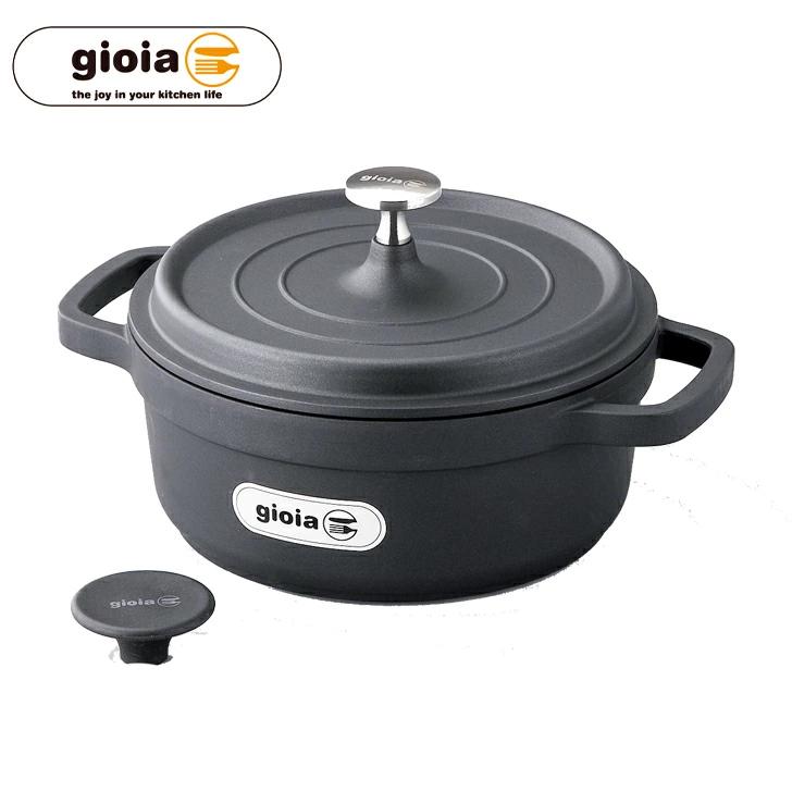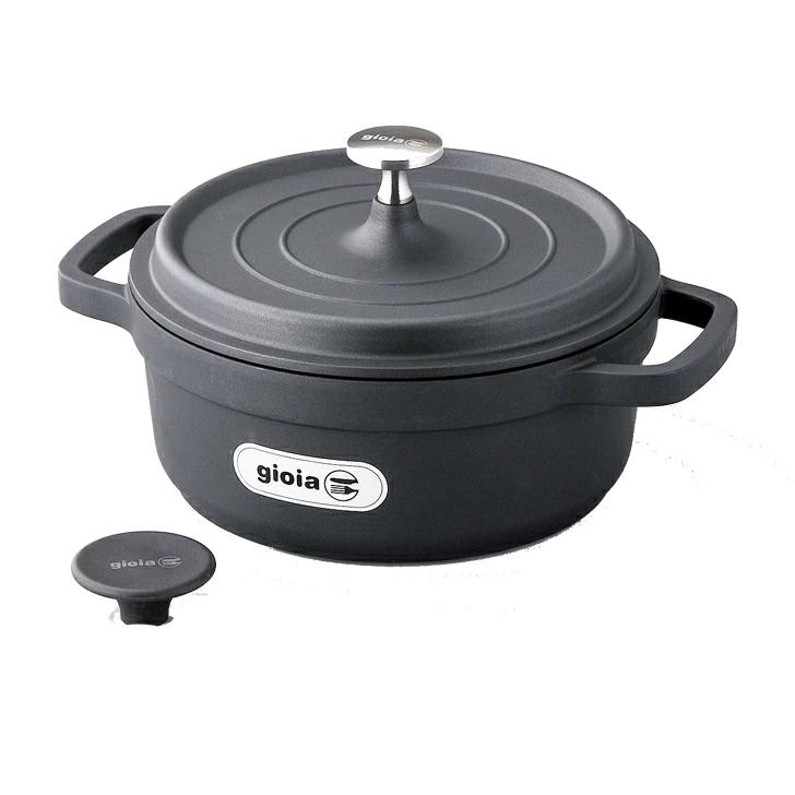 「ジョイア」はイタリア語で「喜び、楽しさ」のこと。毎日のお料理を楽しく、喜びのあるものに。軽くて使いやすいアルミダイカスト製のキャセロール。内面はフッ素コート加工でお手入れも簡単です。つまみは、ステンレス製・樹脂製の各1ヶ付属。ステンレス製つまみを使えば、オーブン調理OK(240℃まで)