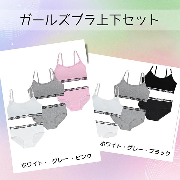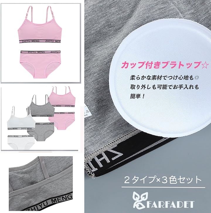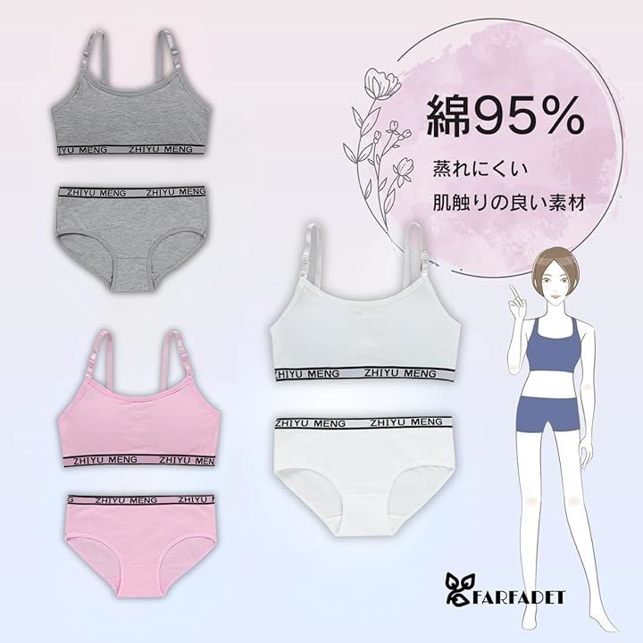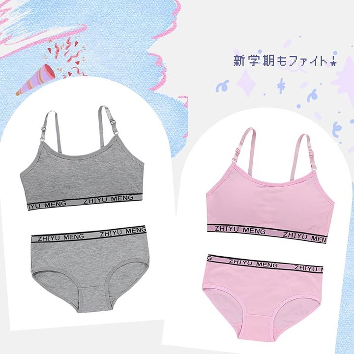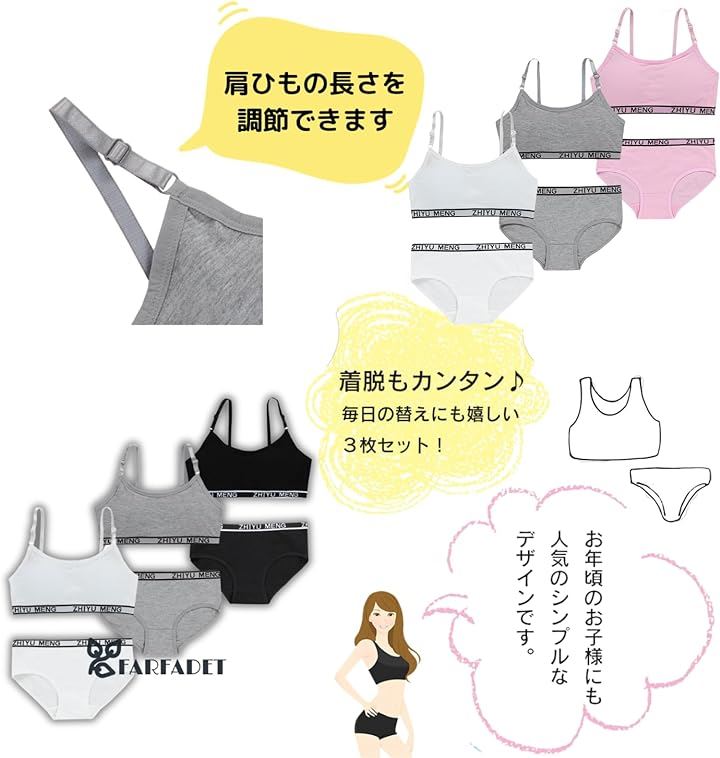 肩ひもの長さ調節可能で、成長に合わせて長く使えるジュニアブラジャー&ショーツ。