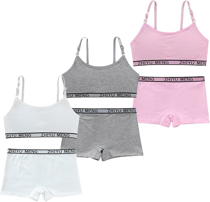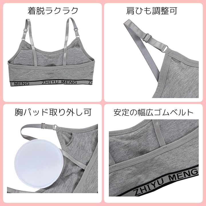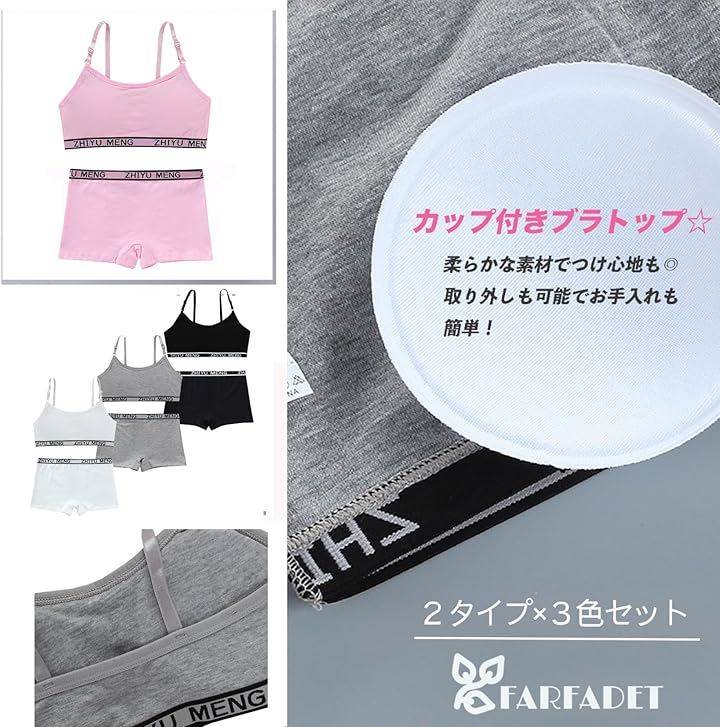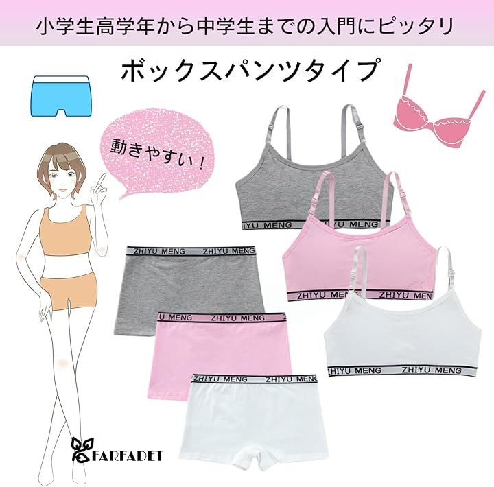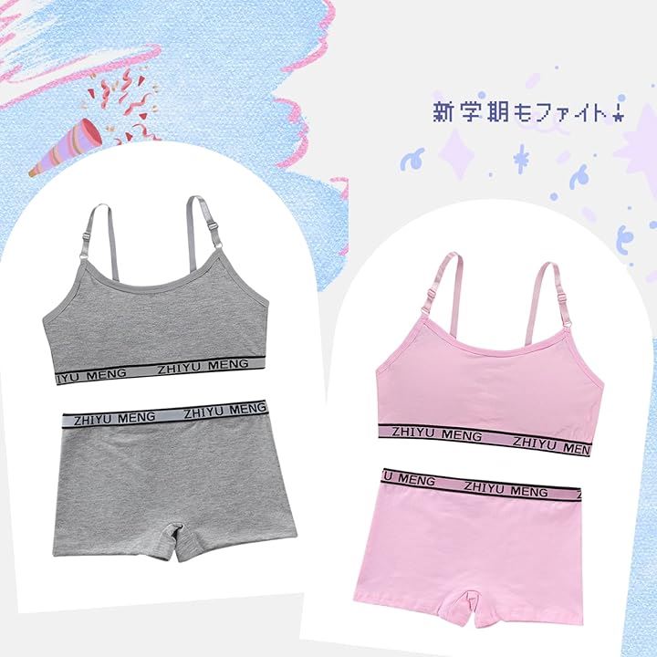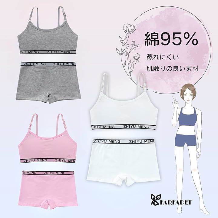 肩ひもの長さ調節可能で、成長に合わせて長く使えるジュニアブラジャー&ボクサーパンツ。