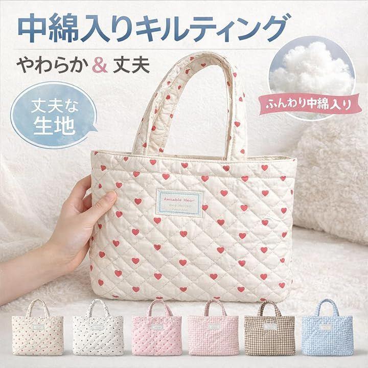 白地x赤ハート、白地x黒ハート、ピンク地xピンクハート、ハートキルティングxピンクギンガムチェック、ハートキルティングxブラウンギンガムチェック、ハートキルティングxブルーギンガムチェックからお選びいただけます。