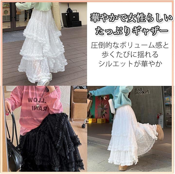 たっぷりギャザー&フリルが作るふんわりシルエットのティアードスカートです。