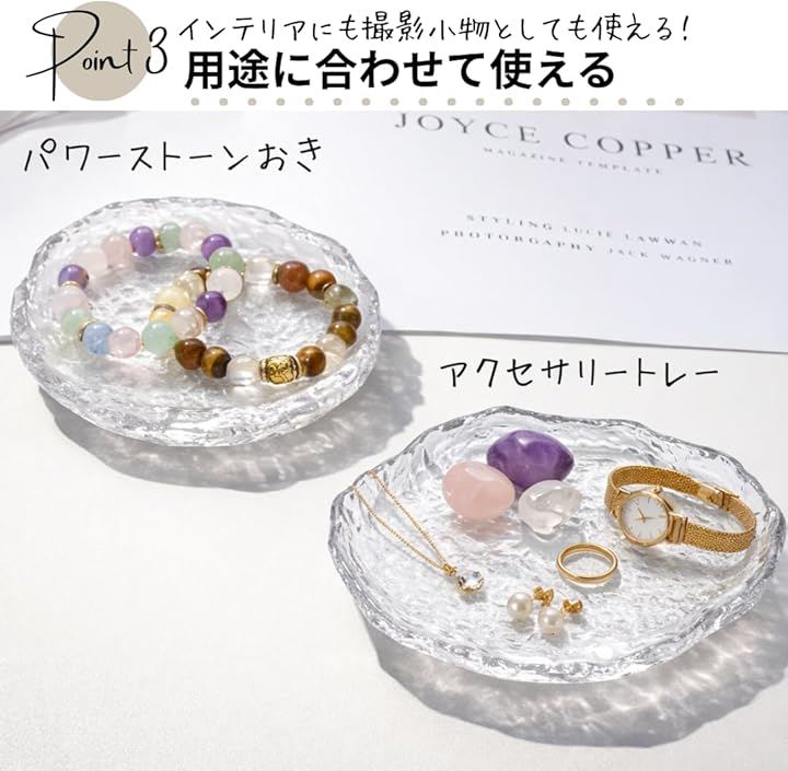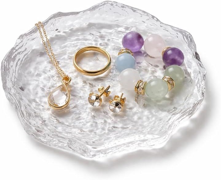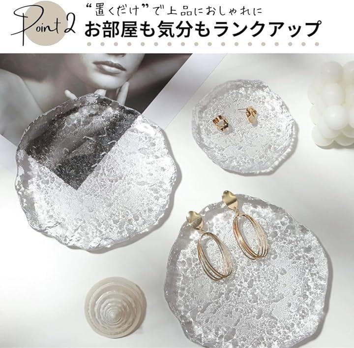 「透明感と煌めきが美しい、ジュエリーを引き立てるトレー」クラッシュガラスのデザインが美しいジュエリートレー。