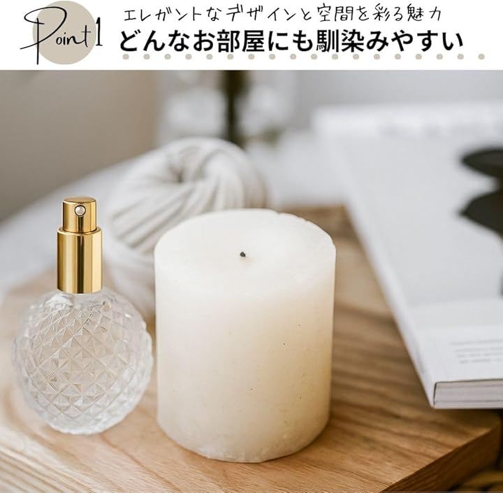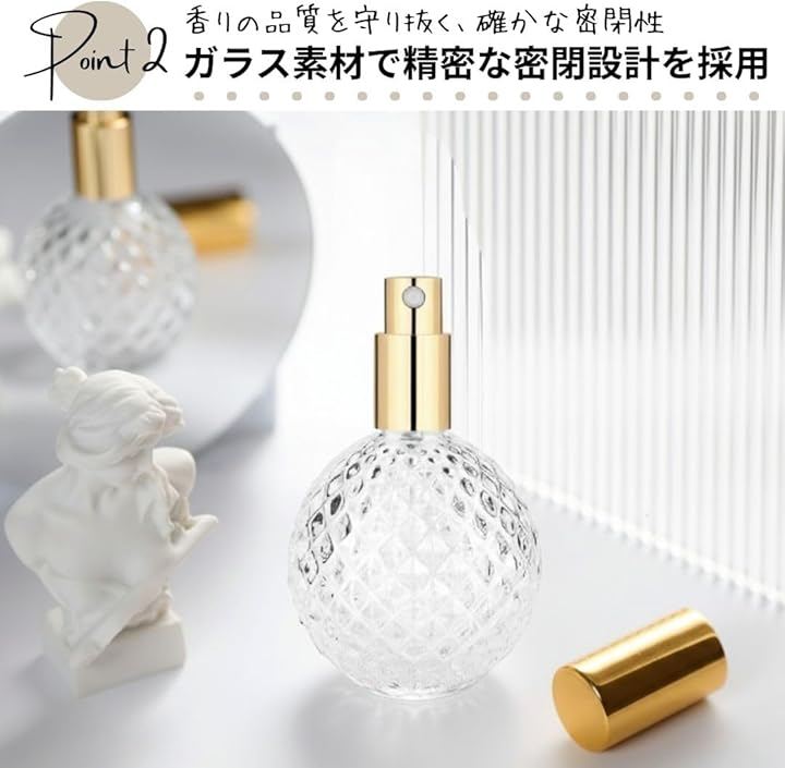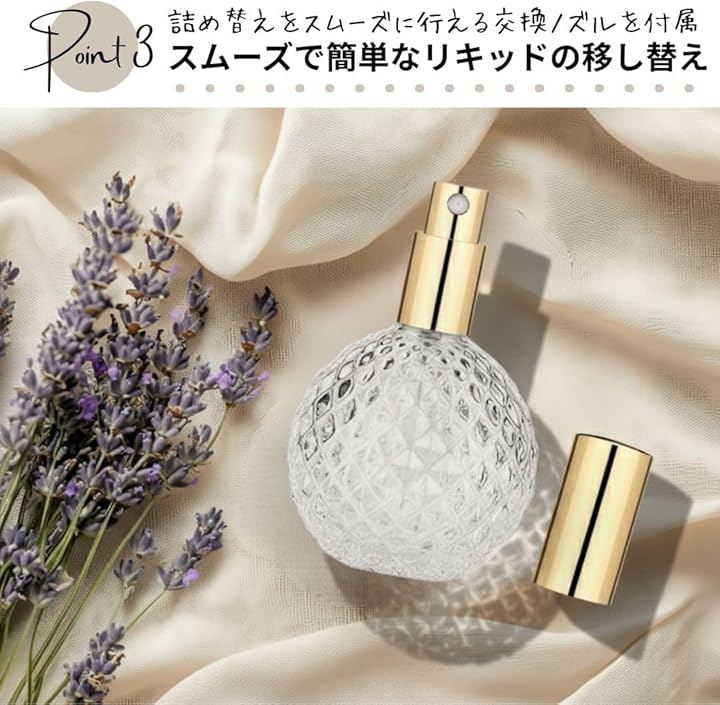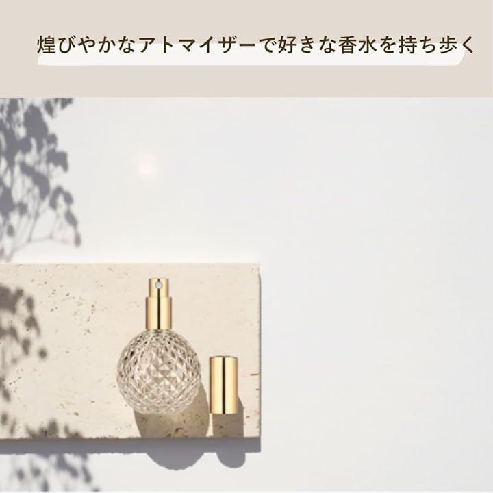 「エレガントなデザインと空間を彩る魅力」このガラス製アトマイザーは、単なる香水の詰め替え容器に留まらない。光を受けてキラキラと輝くデザインは、ドレッサーや棚の上でオブジェのようにおしゃれな存在感を放ち、お部屋の雰囲気を格上げします。