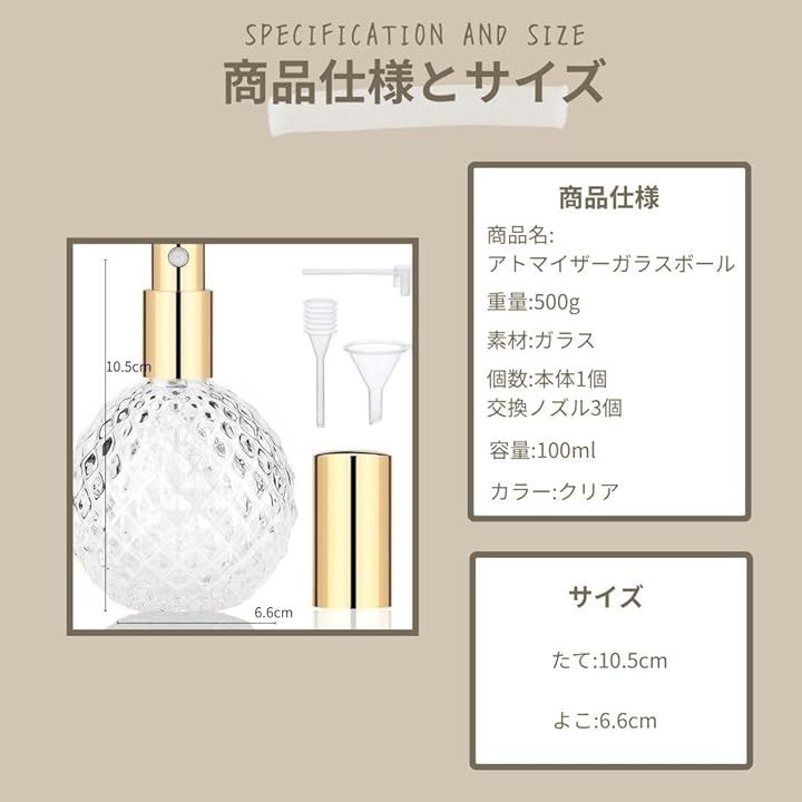 「商品仕様」商品名:アトマイザーガラスボール 重量:500g 素材:ガラス 個数:本体1個 交換ノズル3個 容量:100ml カラー:クリア サイズ:縦10.5cm 横6.6cm