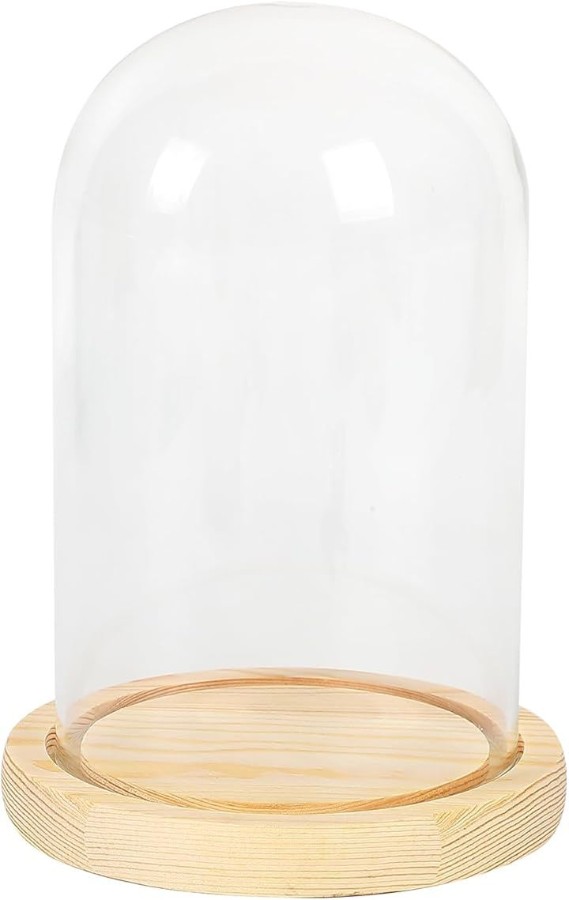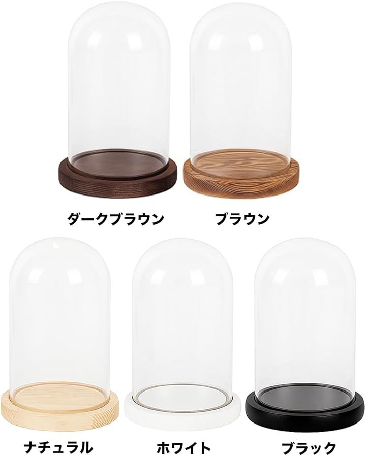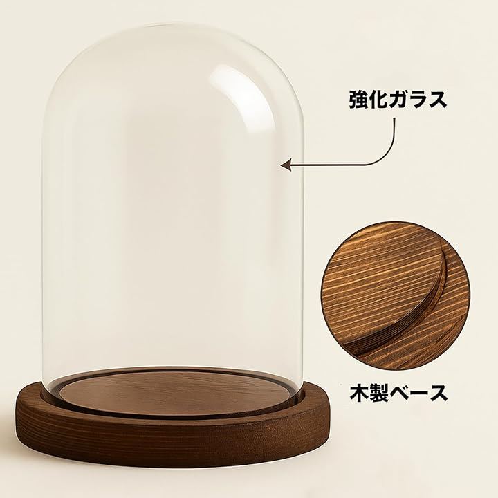 「商品説明」木製ベースと強化ガラスを組み合わせたシンプルで高級感のあるガラスドームケースです。